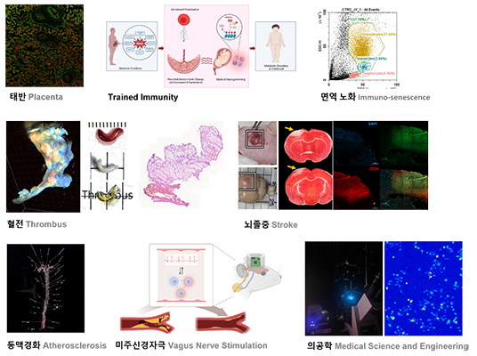 공학 연구실과 다양한 공동 연구를 진행하고 있으며 물리적 에너지로 면역세포의 변화를 분석하고, 뇌졸중 유발 모델을 생체 의학적으로 분석해 뇌졸중 진단과 치료에 기여하기 위한 연구를 진행하고 있음.